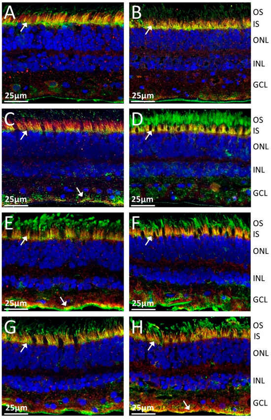 Representative images of immunofluorescent double labeling of outer retina with sera from presumed CAR and AR patients, specific for anti-TULP1 AAbs. (A,B)—AIR sera; (C–H)—CAR sera. Seropositive anti-TULP1 AAbs (green); commercial anti-TULP1 antibodies (red). Overlapping staining (yellow); DAPI stained nuclei (blue). Arrows point at double immunofluorescent staining of the inner segments in photoreceptor cells. Abbreviations: OS, outer segments; IS, inner segments; ONL, outer nuclear layer; INL, inner nuclear layer; GCL, ganglion cell layer.