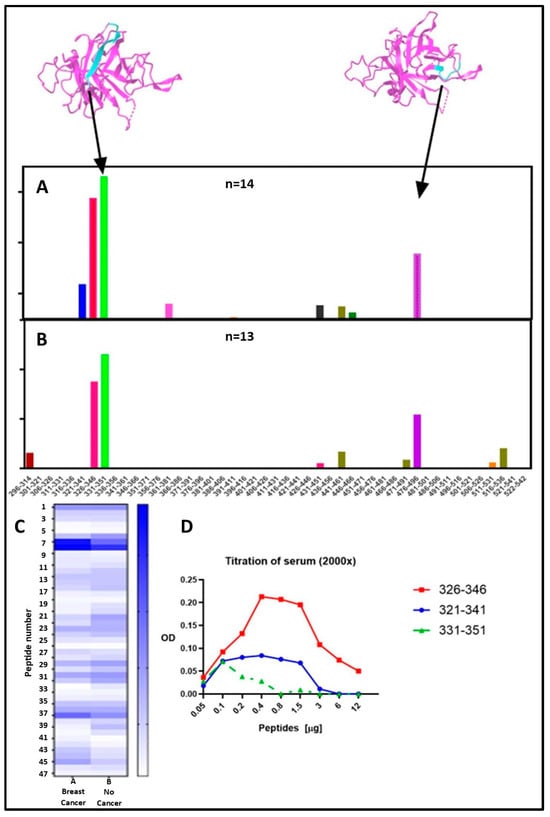 Comparison of epitope mapping of TULP1 carboxyl-terminal domain. (A,B)—bar graphs showing the summary of serum reaction against 20 mer peptides. Position of major epitopes shown in topology diagrams of the TULP1 COOH-terminal model (above the bars). Both major epitopes are exposed on the surface of TULP1 protein, with epitope 1 sequence 331–341 and epitope 2 sequence 480–487. (C) Heatmap analysis of breast CAR (n = 14) and AIR (n = 13) patient’s anti-TULP1 AAbs using GraphPad Prism software version 9. (D) Titration of serum antibodies against peptides within the TULP1 major epitope sequence 331–341. The peptide 321–341 was the most reactive with serum (red).