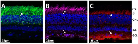 Comparison of immunofluorescent staining of human retina with (A) anti-Recoverin antibody (green), (B) anti-Rab6A MAb, (magenta), and (C) anti-TULP1 Mab (red), DAPI-nuclei staining (blue). Arrows point at retinal structures that are immunostained by specific antibodies as indicated in (A–C). Abbreviations: OS, outer segments; IS, inner segments; ONL, outer nuclear layer; INL, inner nuclear layer; GCL, ganglion cell layer.