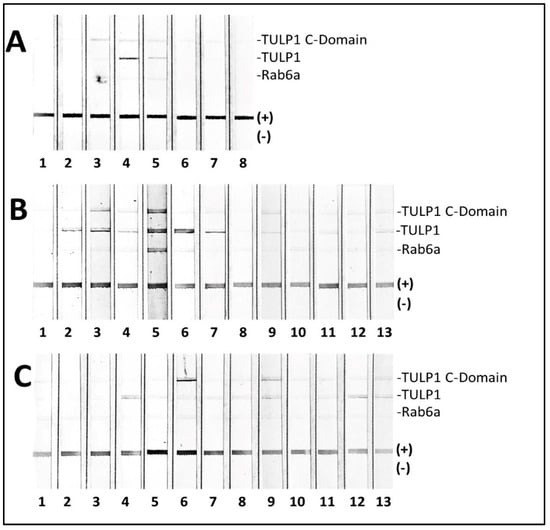 In addition, we wanted to know whether the sera of patients diagnosed other ocular problems contain anti-TULP1 and anti-Rab6 AAbs. We analyzed three groups of patients diagnosed as follows: autoimmune uveitis (n = 13), retinitis pigmentosa (n = 13), and SLE (n = 8) groups. All RP subjects were collected before genetically testing was available. Immunoblots containing TULP1, its conservative C terminal domain, and Rab6 proteins were printed on the membrane. The results presented in Figure 5 show that the SLE group (A) had 2/8 seropositive TULP1 serum samples, with 6/13 in the RP group (B), including 2 subjects with AAbs against the conservative domain, and 4/13 in the uveitis group (C), with 2 against the carboxyl domain being anti-TULP1 positive. Rab6 was recognized only by one serum in the RP group (subject 5). This implies that the presence of anti-TULP1 AAbs are more distributed than was anticipated; however, their significantly high presence in breast cancer patients remains difficult to explain.