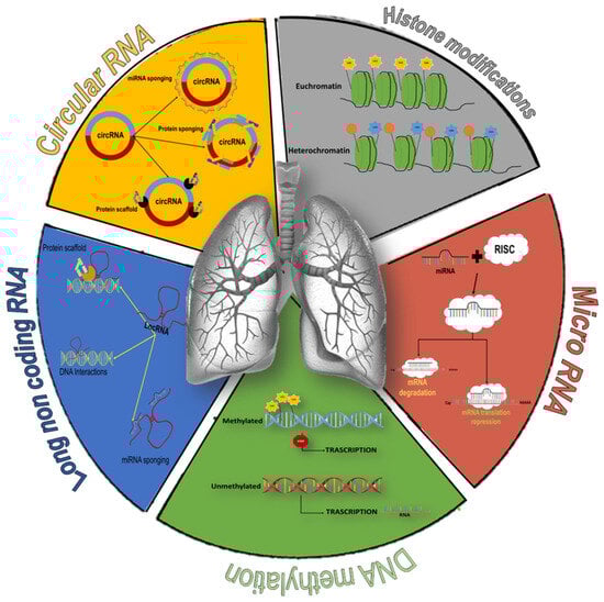 Epigenetic regulation can occur at various levels, including DNA methylation, histone modifications, and modulation of non-coding RNA (ncRNA) [9,10]. Emerging evidence indicates that epigenetic regulation plays a crucial role in COPD development and progression (Figure 2) [9,10,11], and the reversibility of epigenetic alterations makes them valuable therapeutic targets for treating COPD patients [9,10]. Furthermore, the possibility of associating epigenetic alterations with disease progression could suggest the use of epigenetic elements as diagnostic and prognostic COPD biomarkers. This study aims to provide an objective, comprehensive, and updated overview of the most recent insights into the epigenetic modifications post-COVID-19 associated with COPD, and attempts to summarize epigenetic factors that could serve as potential new biomarkers and therapeutic targets for the treatment of patients with COPD.
