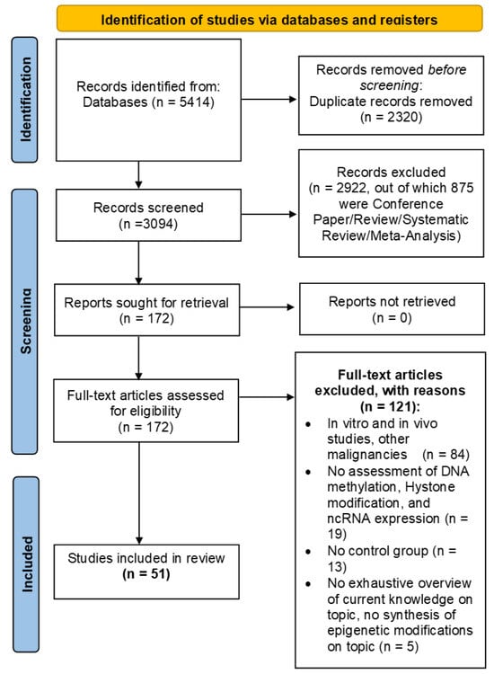 Two independent reviewers (R.R. and P.B.) checked the pool of 3094 abstracts collected from PubMed and Scopus search engine outputs; any disagreement was discussed with C.C. as the arbiter. Titles and abstracts were screened, and 2922 were removed through a semi-automatic script created via MATLAB R2024a (The MathWorks, Inc., Natick, MA, USA), according to PICOS criteria related to Study Design (875 papers) and irrelevance to the research question (2047 papers). The remaining 172 papers were checked for eligibility according to the remaining PICOS criteria; all in vitro and in vivo studies and studies with participant with other malignancies (84), all studies without assessment of DNA methylation, histone modification, or ncRNA expression (19), all studies with no control group (13), and lastly, all studies that did not provide a comprehensive overview of current knowledge on the topic or did not have a summary of epigenetic changes on the topic (5) were excluded. Finally, 51 articles were included, as summarized in Table 4, Table 5, Table 6, Table 7, Table 8 and Table 9, which shows the main information of each, divided according to epigenetic mechanisms in COPD patients.