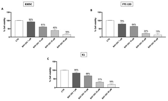 Effect of BAY-293 on cell viability. BAY-293 treatment was able to significantly reduce cell viability in a concentration-dependent manner compared to the control group (CTR) in the anaplastic thyroid cancer cell line 8305C (A), the follicular thyroid cancer cell line FTC-133 (B), and the papillary thyroid cancer cell line K1 (C). Data are representative of at least three independent experiments. Values are means ± SDs. We used one-way ANOVA tests followed by Bonferroni post hoc tests for multiple comparisons.
