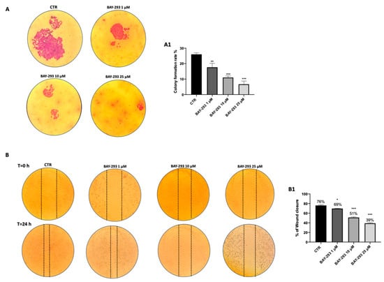 Effect of BAY-293 on colony formation and migration. The colony formation assay using 8305C cells treated with BAY-293 for 24 h at concentrations of 1 μM, 10 μM, and 25 μM showed a significant reduction in colony formation compared to control untreated 8305C cells (CTR) ((A), see score panel (A1)). ** p < 0.01 vs. CTR; *** p < 0.001 vs. CTR. The wound healing assay (scratch test) revealed a significant reduction in the number of cells migrating to the scratched area and, thus, a reduced percentage of wound closure following 24 h of BAY-293 treatment at concentrations of 1 μM, 10 μM, and 25 μM ((B), see score panel (B1)). * p < 0.05 vs. CTR; *** p < 0.001 vs. CTR. Data are representative of at least three independent experiments. Values are means ± SDs. We used one-way ANOVA tests followed by Bonferroni post hoc tests for multiple comparisons.