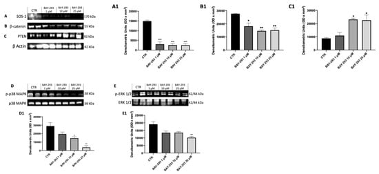 Effect of BAY-293 on the KRAS/SOS-1 pathway in 8305C cells. The blots revealed a significant modulation of KRAS/SOS-1 marker expression following BAY-293 treatment. BAY-293 at concentrations of 1 μM, 10 μM, and 25 μM was able to significantly reduce the expression of son of sevenless 1 (SOS-1) (A), see densitometric analysis panel (A1) and β-catenin (B), see densitometric analysis panel (B1) compared to untreated 8305C cells. At concentrations of 10 μM and 25 μM, BAY-293 significantly reduced phosphorylated p38 mitogen-activated protein kinase (p38 MAPK) (D), see densitometric analysis panel (D1) levels compared to untreated cells, while only the highest concentrations of 25 μM was able to significantly reduce extracellular signal-regulated kinase (p-ERK) levels (E), see densitometric analysis panel (E1). Treatment with BAY-293 (10 μM and 25 μM) was also able to increase the expression of tumor suppressor protein phosphatase and tensin homolog (PTEN) (C), see densitometric analysis panel (C1). *** p < 0.001 vs. control (CTR); ** p < 0.01 vs. CTR; * p < 0.05. Our data are the result of three experimental replicates. Data are representative of at least three independent experiments. Values are means ± SDs. We used one-way ANOVA tests followed by Bonferroni post hoc tests for multiple comparisons.