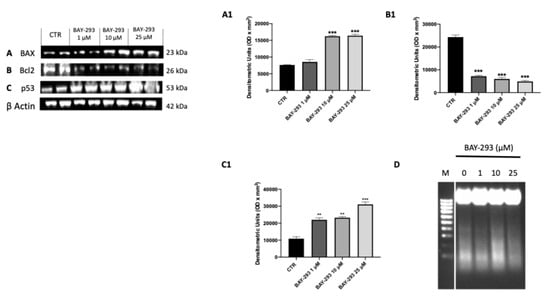 Effect of BAY-293 on apoptosis marker expression in 8305C cells. Western blot analysis revealed a significant modulation of apoptosis markers expression following BAY-293 treatment. BAY-293 was able to significantly increase the levels of pro-apoptotic markers Bcl2-associated X, apoptosis regulator (BAX) (A), see densitometric analysis panel (A1) and tumor protein (p53) ((C), see densitometric analysis panel (C1) and significantly reduced the expression of anti-apoptotic protein B-cell leukemia/lymphoma 2 protein (Bcl2) (B), see densitometric analysis panel (B1). Analysis of genomic DNA fragmentation in 8305C cells after treatment with BAY-293 at concentrations of 1 μM, 10 μM, and 25 μM for 24 h revealed a typical ladder pattern of internucleosomal fragmentation in cells after 10 μM BAY-293 treatment for 24 h (D). *** p < 0.001 vs. CTR; ** p < 0.01 vs. CTR. Data are representative of at least three independent experiments. Values are means ± SDs. We used one-way ANOVA tests followed by Bonferroni post hoc tests for multiple comparisons.