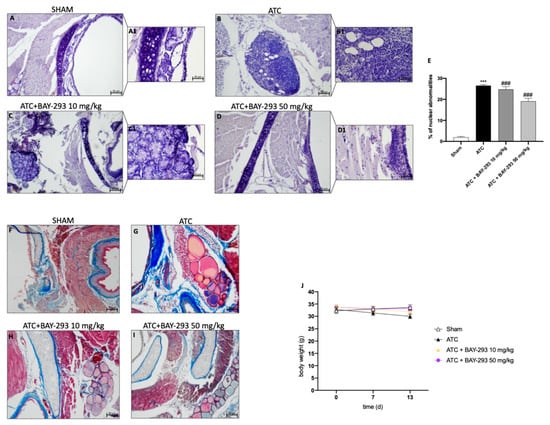 Effect of BAY-293 on tumor growth in an orthotopic model of ATC. Hematoxylin and eosin staining revealed that BAY-293 treatment at doses of 10 mg/kg (C,C1) and 50 mg/kg (D,D1) was able to reduce features of a high-grade malignant neoplasm such as high-grade nuclear atypia, marked cellular pleomorphism, necrosis, and neutrophil infiltration compared to the ATC mice (B,B1), see score panel (E); (A,A1) Sham group. Masson’s trichrome staining of ATC tumors. The collagen is stained in blue and cytoplasm is stained in red. BAY-293 treatment at doses of 10 and 50 mg/kg reduced infiltration of collagen fibers around the tumors compared to the ATC group (F–I). No important changes in the animals’ body weights were shown during the experiments (J). Values are means ± SDs. Distribution of values come from individual animals. One-way ANOVA test. *** p < 0.001 vs. sham; ### p < 0.001 vs. ATC. The images are shown at 20× (50 μm of the bar scale) and 40× magnification (20 μm of the bar scale).