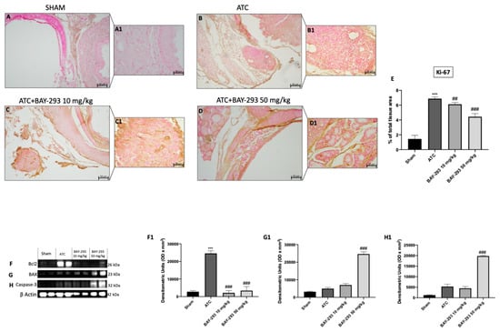 Among the histopathological features of ATC, beyond necrosis, extensive neutrophilic inflammation, and the presence of fibrous tissue, it is characterized by a high Ki-67 proliferation index based on the percentage of positive tumor nuclei (>30%) []. Ki-67 overexpression correlates with adverse outcomes in undifferentiated thyroid cancer []. According to our findings, the ATC group (Figure 6B,B1, see score E) compared to the sham group (Figure 6A,A1, see score E) showed a significant overexpression of Ki-67-positive nuclei. Figure 6 illustrates how BAY-293 treatment at doses of 10 and 50 mg/kg significantly reduced the expression Ki-67 in orthotopic tumors, thereby contributing to the reduction of tumoral proliferation and invasion (Figure 6C,C1,D,D1, see score panel E). Moreover, Western blot results conducted on samples collected in the orthotopic model confirmed that BAY-293 was able to induce activation of programmed cell death. Treatment with BAY-293 led to a downregulation of the antiapoptotic marker Bcl2 (Figure 6F,F1) and to an increase in the expression levels of the pro-apoptotic proteins BAX (Figure 6G,G1) and caspase 3 (Figure 6H,H1), confirming the results obtained in vitro.