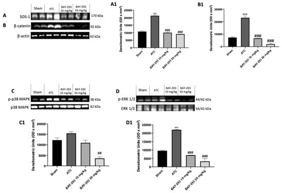 Effect of BAY-293 on the KRAS/SOS-1 pathway in an orthotopic model of ATC. The blots revealed a significant reduction in son of sevenless 1 (SOS-1) after treatment with BAY-293 at the doses of 10 mg/kg and 50 mg/kg compared to sham mice (A), densitometric analysis panel (A1). BAY-293 significantly reduced β-catenin levels (B), densitometric analysis panel (B1) and phosphorylated extracellular signal-regulated kinase (p-ERK) levels (D), densitometric analysis panel (D1) at doses of 10 mg/kg and 50 mg/kg compared to ATC mice. Only the highest dose of 50 mg/kg of BAY-293 was able to significantly reduce the expression of phosphorylated p38 mitogen-activated protein kinase (p38 MAPK) (C), densitometric analysis panel (C1) compared to the ATC group. Values are means ± SDs. Distribution of values come from individual animals. One-way ANOVA test. *** p < 0.001 vs. sham; ## p < 0.01 vs. ATC; ### p < 0.001 vs. ATC.