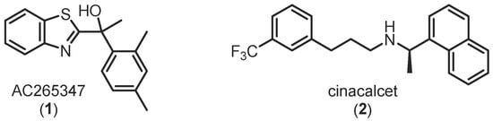 Chemical structures of two chemical classes of CaSR positive allosteric modulators (PAMs): benzothiazole (AC265347, 1) and naphthylalkylamine (cinacalcet, 2) [].