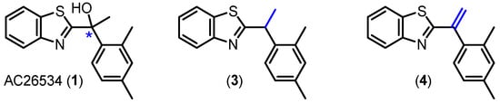 AC265347 (1) (Figure 1), identified by ACADIA Pharmaceuticals from a screening library, is composed of a benzothiazole scaffold, a stereogenic centre bearing a tertiary alcohol and a dimethyl-substituted phenyl motif. This molecule is a positive allosteric modulator of the calcium-sensing receptor (CaSR) with intrinsic agonism (ago-PAM), and structurally distinct from the typical naphthylalkylamine class of CaSR modulators (e.g., cinacalcet (2), Figure 1). The initial in vivo study used the racemic mixture of AC265347 and demonstrated potent suppression of PTH release in rodents, consistent with a CaSR PAM profile []. Notably, the S-enantiomer had 10-fold greater potency than the R-enantiomer [,]. Further analysis confirmed AC265347’s binding selectivity for the CaSR, with no off-target activation at the GABAb receptors and PTH1 receptors, thus validating its therapeutic potential []. The evaluation of AC265347 as a CaSR therapeutic was discontinued for undisclosed reasons, with the last publication in 2011. However, this unique molecule warrants further investigation based on its ago-PAM activity accompanied by an improved side-effect profile.