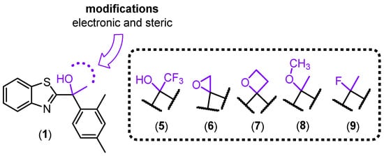 Herein, we aimed to delineate the role of H-bond acceptor and donor predicted to partake in binding to the CaSR. The suite of analogues (Figure 3) includes subtle structural modifications to the OH group, for example, by substitution with a methoxy group (8). This modification removes the H-bond donor property, thus allowing examination of the H-bond acceptor ability alone. Bioisosteric replacement of the OH group with fluorine (9) is commonly used in medicinal chemistry because of its similarity in size, polarity and electronegativity between oxygen and fluorine atoms [,,]. The substitution strategy is thought to provide metabolic stability, mainly due to the high C–F bond energy and conformational disturbance to avoid recognition by enzymes [,,,]. The replacement of OH for F is generally restricted to the H-bond acceptor ability, which thus allows examination of the H-bond donor property provided by the hydroxy hydrogen atom. Additionally, the epoxide (6) [] and oxetane (7) [] were synthesised to challenge the importance of spatial orientation and rotational freedom on PAM activity at the CaSR. While the oxetane derivative angles the bonds almost perpendicularly at ~90°, the epoxide derivative is more constrained, with a bond angle at 60° (Figure 3), thereby bringing the O and C atoms in significantly closer proximity compared to the parent compound (~105°) and increasing the relative distance between the aromatic motifs. We also included a previously published analogue (5) [] whereby the methyl substituent at the stereocentre was replaced with trifluoromethyl to enable further comparisons. We anticipate changes in allosteric effect with these structural changes, thus revealing the importance in maintaining the rotational freedom at the stereogenic centre and allowing us to dissect the role of H-bond donor/acceptor properties.