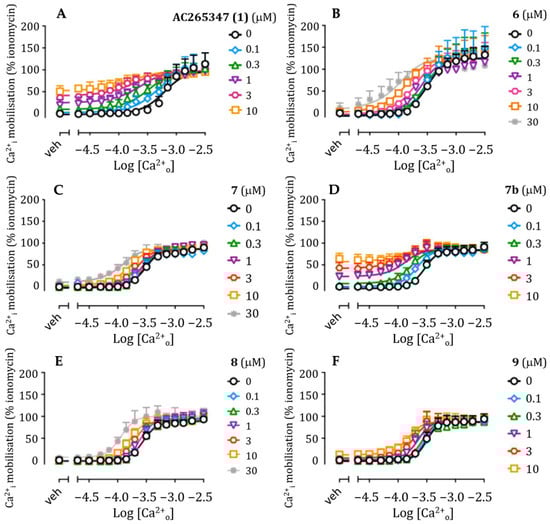 Pharmacological evaluation of AC265347 (1, panel (A)) and analogues for PAM activity using Ca2+i mobilisation assays. Concentration–response curves are shown for Ca2+o in the absence or presence of various concentrations of epoxide 6 (panel (B)), oxetane 7 (panel (C)), allylic alcohol by-product 7b (panel (D)), methoxy 8 (panel (E)) and fluoro 9 (panel (F)) compared to parent compound AC265347 (1) (panel (A)). Data are mean ± SD pooled from n ≥ 3 independent experiments performed in duplicate. Curves through the data points are the best fit of Equation (1) (refer to Section 3.3.2) to the data. NB: None of the estimates were significantly different from that derived for AC265347 (1), p < 0.05 in one-way ANOVA Dunnett’s multiple-comparison post hoc test.