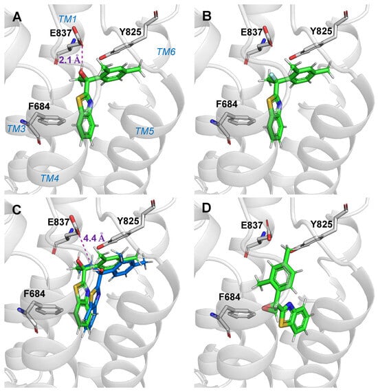 Proposed binding mode of representative compounds: (A) AC265347 (1), (B) compound 9, (C) overlay of AC265347 (1) and compound 7b with a distance of 1.9 Å between the stereogenic carbon centres and (D) compound 6 in the CaSR 7TM in an active model derived from the Cryo-EM structure PDBID:7M3G []. The receptor is shown in cartoon form, depicting the α-helices in light grey. Key amino acid residues (F684, TM3; Y825, TM6 and E837, TM7) and the corresponding ligand are shown in sticks form, with the ligand hydrogens shown to highlight predicted hydrogen bond interactions. The chemical structure representation is as follows: carbon (grey for protein and green for ligands); nitrogen (blue); oxygen (red); hydrogen (white); sulphur (yellow); fluorine (turquoise).