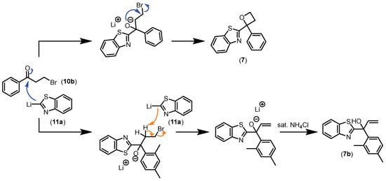 While nucleophilic addition occurred between the lithiated benzothiazole (11a) and the selected carbonyl carbon followed by O-cyclisation with bromide ion as the leaving group to form oxetane 7 (as illustrated in Scheme 2), a significant by-product corresponding to the terminal alkene 7b was also detected. Besides acting as an intended nucleophile, 11a can also act as a base, thereby deprotonating the α-hydrogen. This would subsequently allow the formation of a terminal alkene via elimination, resulting in the allylic alcohol 7b product, thereby preventing the desired intramolecular cyclisation.