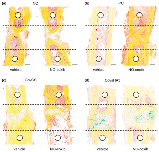Representative images of Movat’s pentachrome stain comparing proportion of mature bone within the defect area 16 weeks after insertion of (a) no material (NC), (b) collagen together with autologous bone (PC), or a PCL-scaffold coated with (c) Col/CS or (d) Col/sHA3 (Col = collagen, CS = chondroitin sulfate, sHA3 = polysulfated hyaluronic acid) in rats treated with either vehicle or NO-coxib. Circles mark the previous position of the inner screws and dotted lines cover the original defect area. Bar = 1 cm.
