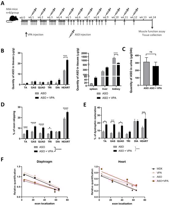 Long-term treatment with VPA increases exon-skipping efficacy. (A) Schematic representation of the treatment of mdx mice with ASO combined with valproic acid (VPA). (B) Effect of VPA on tcDNA-ASO distribution in various tissues. (C) Quantification of tcDNA-ASO in urines of treated mdx mice; urines were collected over a period of 24 h in metabolic cages. (D) Quantification of exon 23 skipping levels by TaqMan RT-qPCR in mdx mice treated with ASO or ASO+VPA. (E) Dystrophin restoration quantified by Western blot in mdx mice treated with ASO or ASO+VPA. (F) Effect of the combination VPA+ASO on Dmd transcript imbalance in diaphragm, and heart analyzed by TaqMan qPCR at different exon junctions. TA: tibialis anterior, GAS: gastrocnemius, QUAD: quadriceps, TRI: triceps and DIA: diaphragm. Results are expressed as the mean ± SEM; n = 6–8 mice per group, * p < 0.05, *** p < 0.001, **** p < 0.0001 and ns: non statistically significant analyzed by two-way ANOVA.