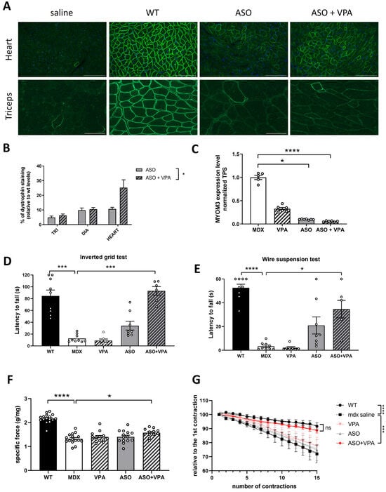 Functional recovery following the combined therapy ASO+VPA. (A) Detection of dystrophin protein (green staining) by immunostaining on transverse sections of muscle tissues (triceps and heart) from WT and mdx mice treated with saline, ASO, VPA or ASO+VPA. Nuclei are labelled with DAPI (blue staining). Scale bar, 100 µm. (B) Quantification of the dystrophin intensity staining in heart and triceps; n = 4 mice per group. (C) Myomesin-3 levels in serum of treated mice detected by Western blot; n = 5–7 mice per group. (D) Latency to fall in seconds in the inverted grid test; n = 6–9 mice per group. (E) Latency to fall in seconds in the wire test; n = 6–9 mice per group. (F) Maximal specific force in mg/g measured from the two tibialis anterior muscles of each mouse; n = 6–8 mice per group. (G) percentage of force drop following a series of 15 eccentric contractions measured on semi-isolated tibialis anterior muscles from treated mdx mice; n = 6–8 mice per group. Results are expressed as the mean ± SEM; * p < 0.05, *** p < 0.001, **** p < 0.0001 and ns: non statistically significant analyzed by two-way ANOVA.
