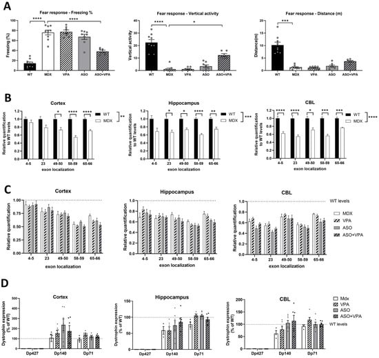 Impact of long-term treatment with VPA in the brain. (A) Unconditioned fear response expressed as percentage of freezing (left panel), vertical activity (middle panel) or distance traveled (right panel) during a 5 min period of observation following a brief scruff restraint (15 s) (mean ± SEM; * p < 0.05; *** p < 0.005; **** p < 0.0001 analyzed by one-way ANOVA followed by Sidak post hoc tests). (B) Relative expression of Dmd transcript levels in mdx compared to WT levels quantified in cortex, hippocampus and cerebellum (CBL) at various exon–exon junctions along the Dmd gene (n = 8 per group) (* p < 0.05; ** p < 0.01 in cortex, *** p < 0.0001 in hippocampus and **** p < 0.0001 in cerebellum). (C) Relative expression of Dmd transcript levels in mdx mice treated with PBS (MDX), VPA, ASO, or the combination of ASO+VPA at various exon–exon junctions along the Dmd gene (n = 8 per group). (D) Quantification of the different dystrophins expression (Dp427, Dp140 and Dp71) in brain tissues (in cortex, hippocampus and cerebellum (CBL)) treated with VPA, ASO, or the combined therapy ASO+VPA by Western blot. The expression of each dystrophin is expressed as a percentage of levels detected in WT mice. Results are expressed as the mean ± SEM.