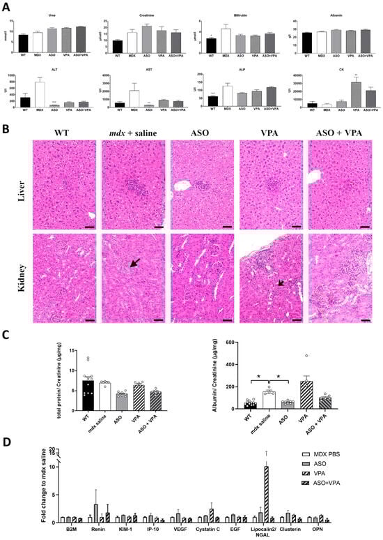 Evaluation of the safety profile of the combined ASO+VPA therapy. (A) Quantification of general toxicity biomarkers in the serum: creatinine, urea, albumin, aspartate aminotransferase (AST), alanine aminotransferase (ALT), alkaline phosphatase (ALP) and bilirubin; n = 7 mice per group, * p < 0.05, **, p < 0.01, and *** p < 0.001 compared to mdx saline, analyzed by the Kruskal–Wallis test. (B) Histopathological analysis from liver and kidney sections from WT and mdx mice treated with saline solution, ASO, VPA or ASO+VPA, stained with hematoxylin–eosin–saffron. In liver (upper panel), small foci of inflammatory cell infiltration were scattered in the hepatic parenchyma of all mice in every group. In kidney (lower panel), no lesions or only sporadic changes were observed in WT mice and mdx saline- and mdx-ASO-treated mice, whereas all VPA and ASO+VPA mice presented histopathological changes ranging from tubular degeneration/regeneration associated with various degree of proteinaceous casts (short arrow) and interstitial inflammation to tubular atrophy and loss and interstitial fibrosis. These changes included basophilic tubules, an early unspecific change that is a relatively common finding in aging mice and was present focally in one mdx saline mouse (arrow). Scale bar = 50 µm. (C) Quantification of total protein/creatinine (left panel) and albumin/creatinine (right panel) in urines of WT and mdx mice treated with saline solution, ASO, VPA or ASO+VPA. * p < 0.05 compared to mdx saline, analyzed by the Kruskal–Wallis test. (D) Quantification of kidney injury biomarkers in the urines of treated mice; n = 7 mice per group, two-way ANOVA analyses. Results are expressed as the mean ± SEM.
