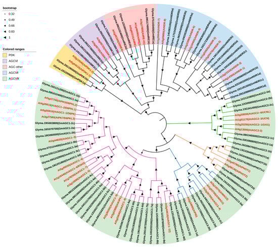 AGC protein kinases are a subgroup of serine/threonine kinases found across eukaryotes; they play essential roles in receptor-mediated growth factor signal transduction. These kinases are critical for regulating plant growth, cell death, immunity, and responses to abiotic stresses. However, AGC protein kinases have not yet been identified in G. max (soybean), and the functions of GmAGC genes in soybeans remain largely unexplored. In this study, we identified 69 GmAGC genes in soybeans and conducted a comprehensive analysis of their characterization, collinearity, sequence structure, cis-elements, and expression patterns. Several classification systems for the AGC kinase family in plants have been proposed. In 2003, the A. thaliana AGC kinase family was divided into six subfamilies based on evolutionary relationships and functional differences: PDK1, AGCVI, AGCVII, AGCVIIIa (including AGC1 and AGC3), AGCVIIIb (including AGC2 and AGC4), and the AGC (other) subfamily []. In 2007, the AGCVIII members of A. thaliana were further classified into four subgroups based on their protein domains: AGC1, AGC2, AGC3, and AGC4, and the AGC kinase family was reorganized into five subfamilies: PDK1, AGCVI, AGCVII, AGCVIII, and AGC (other) []. This nomenclature system is widely adopted in plant research [,]. An alternative classification system, based on the one used for human and animal AGC kinases, divides a plant’s AGC kinase family into seven subfamilies: PDK, S6K (AGCVI), NDR (AGCVII), IRE (AGC (other)), AGC1, AGC2, and AGC2 related []. In this study, we classified the GmAGC kinase genes in soybeans into five subfamilies, PDK1, AGCVI, AGCVII, AGCVIII, and AGC (other), based on the second classical classification system and the phylogenetic relationship with AtAGC genes.