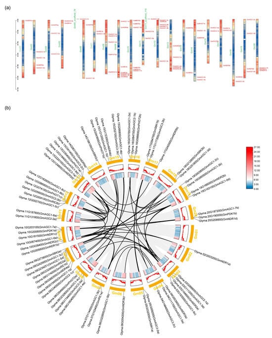 Chromosomal distribution and collinearity analysis of 69 GmAGC genes in Glycine max. (a) Chromosomal location of GmAGCs gene family members in G. max. The red to blue gradient represents varying gene density, with red indicating regions of high gene density and blue indicating of low gene density. (b) Collinearity relationship of GmAGCs gene family members in G. max.
