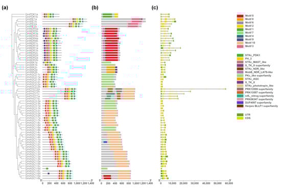 Gene structure and motif analysis of GmAGC genes in Glycine max. (a) Evolutionary relationship and distribution of conserved motifs of GmAGCs gene family members in G. max. (b) Distribution of essential domains of GmAGCs gene family members in G. max. (c) Gene structure of GmAGCs gene family members in G. max.