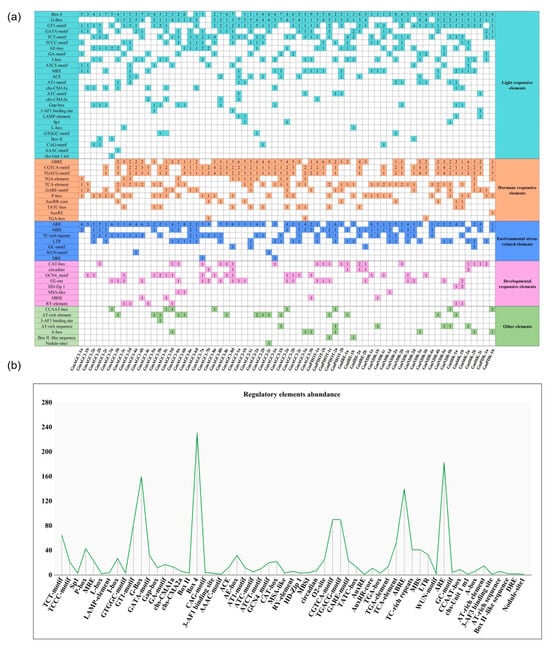 Predicted cis-elements of the GmAGC gene family: (a) cis-element analysis in the promoter region of GmAGC genes. The number of cis-elements in each gene is indicated by the number. (b) Frequency of cis-elements in the promoter regions of GmAGCs.