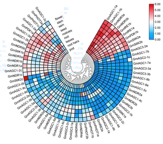 The RNA-seq analysis identified nine GmAGC genes (GmAGC1-1a, GmAGC1-1b, GmNDR3a, GmNDR3b, GmIRE1a, GmIRE1b, GmPDK1b, GmS6K2a, and GmS6K2b) with high transcript abundance across all tissues examined (Figure 5). In contrast, several genes (GmAGC2-1b, GmIRE2b, GmNDR2a, GmAGC1-5c, GmAGC1-8a, and GmAGC1-8b) displayed low transcript levels. Most GmAGC genes exhibited preferential expression, with distinct peaks in one or two specific tissues (Figure 5). Interestingly, three genes (GmNDR2a, GmNDR2b, and GmAGC1-4c) were exclusively expressed in flowers, suggesting their specialized roles in floral development.
