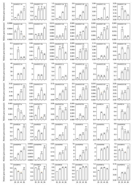qRT-PCR expression patterns of GmAGC genes in roots under salt stress. The salt treatment time were 0, 2, 4, and 6 h. The black asterisks indicate significantly higher expression while red ones show significantly lower expression. * p < 0.05, ** p < 0.01, *** p < 0.001, ns means no significant difference, according to the Student’s t test.