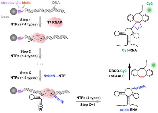 A schematic illustration of the synthesis strategy. The site-specific azido-labeled RNA (azido-RNA) is generated by means of PLOR through hybrid-phase transcription with a pause–restart mode (following the gray arrows). The transcription is divided into X + 1 steps, with azido-NTP incorporated into a specific position of the RNA at step X. The pause and restart at each step are precisely controlled by additions of limited NTPs to the solid phase. After step X + 1, the full-length azido-RNA is collected from the liquid phase. After purification, a post-transcriptional SPAAC click chemistry reaction between azido-RNA and DBCO-Cy3 is conducted to produce Cy3-RNA.