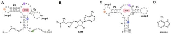 The secondary structures of RNAs synthesized by means of ePLOR. (A) The secondary structure of riboSAM. The labeled sites U43, U55, U74, and U84 are highlighted in orange, purple, blue, and green, respectively. (B) The chemical structure of SAM (the specific ligand for riboSAM). (C) The secondary structure of riboA. The labeled sites U22, U39, and U65 are highlighted in orange, purple and blue, respectively. (D) The chemical structure of adenine (the specific ligand for riboA).