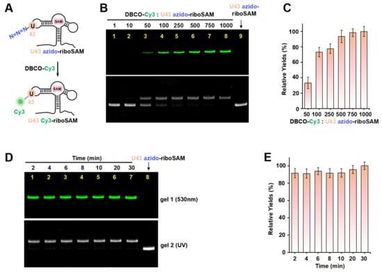 Under the conditions of the DBCO-Cy3 concentration being 500 times that of U43 azido-riboSAM, we further investigated the reaction rate. Urea-PAGE detection showed that the reaction between the two was extremely rapid, being essentially complete after 2 min. This was confirmed by the observation of equal amounts of U43 Cy3-riboSAM (fluorescent imaging) and the complete conversion of all U43 azido-riboSAM to U43 Cy3-riboSAM (UV imaging) at different reaction times (2, 4, 6, 8, 10, 20, and 30 min) (Figure 3D,E). These results demonstrate that the SPAAC reaction occurring on the riboSAM stem-loop was rapid and efficient, enabling the efficient incorporation of Cy3 into the U43 site.