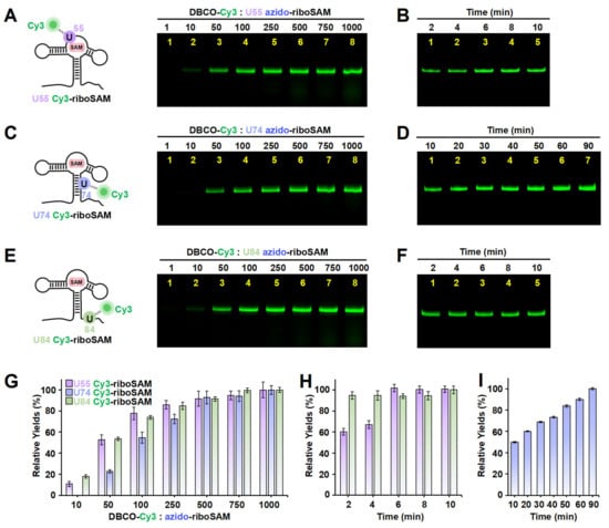 The incorporation of Cy3 into the U55, U74, and U84 positions of riboSAM using ePLOR. (A–F) Fluorescent PAGE images of U55 Cy3-riboSAM (A,B), U74 Cy3-riboSAM (C,D), and U84 Cy3-riboSAM (E,F) generated at different concentrations of DBCO-Cy3 (A,C,E) and after different reaction times (B,D,F). (G) Relative yields of the three RNAs detected in (A,C,E). (H) Relative yields of U55 Cy3-riboSAM and U84 Cy3-riboSAM detected in (B,F), respectively. (I) Relative yields of U74 Cy3-riboSAM detected in (D). Mean ± s.d. values of three replicates are shown.