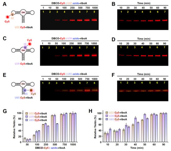 The incorporation of Cy5 into the U22, U39, and U65 positions of riboA using ePLOR. (A–F) Fluorescent PAGE images of U22 Cy5-riboA (A,B), U39 Cy5-riboA (C,D), and U65 Cy5-riboA (E,F) generated at different concentrations of DBCO-Cy5 (A,C,E) and after different reaction times (B,D,F). (G) Relative yields of the three RNAs detected in (A,C,E). (H) Relative yields of the three RNAs detected in (B,D,F). Mean ± s.d. values of three replicates are shown.