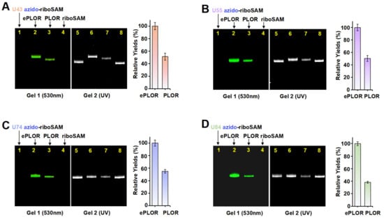 A comparison of efficiency between PLOR and ePLOR for site-specific Cy3-riboSAM synthesis. Fluorescent (left) and UV (right) PAGE images of U43 Cy3-riboSAM (A), U55 Cy3-riboSAM (B), U74 Cy3-riboSAM (C), and U84 Cy3-riboSAM (D) produced by means of ePLOR (lanes 2 and 6) and PLOR (lanes 3 and 7), respectively. The U43/U55/U74/U84 azido-riboSAMs (lanes 1 and 5) and unlabeled riboSAM (lanes 4 and 8) were loaded as controls. The relative yields from ePLOR were set to 100% in the individual RNA system.