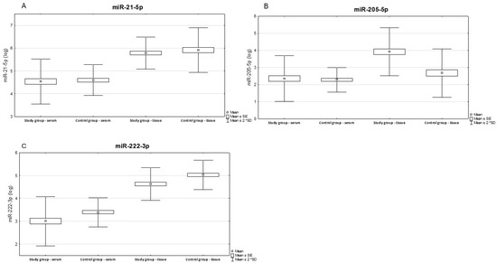Illustrates the differences in expression levels between tissue and serum in the study and control groups. Results of paired serum-tissue t-tests for the control and study groups. Results expression miR-21-5p (A), miR-205-5p (B), miR-222-3p (C).
