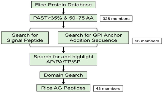 Considering the characteristics of AG peptides, we developed a detailed identification process (Figure 1). Initially, 328 potential AG peptides were identified in rice by searching for proteins between 50 and 75 amino acids long, with a biased amino acid composition of at least 35% PAST (Figure 1; Supplementary Materials, Table S2). Signal peptides are crucial for facilitating the glycosylation of AG peptides in the endoplasmic reticulum. Meanwhile, a glycosylphosphatidylinositol (GPI) anchor is required to anchor AG peptides to the plasma membrane. An additional screening process was performed on these 328 proteins to identify those that possess both a signal peptide and a GPI anchor (Supplementary Materials, Table S3). We also examined whether these proteins had dipeptide repeats (Ala–Hyp, Ser–Hyp, and Thr–Hyp), excluding proteins containing other domains (Supplementary Materials, Table S3). In total, 43 AG peptides were identified (Figure 1; Supplementary Materials, Table S2).