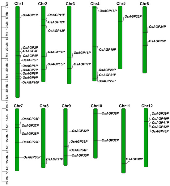 The 43 AG peptide genes identified were named OsAGP1P through OsAGP43P according to their chromosomal positions (Figure 2). These genes encode proteins with a length of 53–75 amino acids, with predicted molecular weights and isoelectric points from 5.09 kDa/4.00 to 7.79 kDa/12.10 (Table 1; Supplementary Materials, Table S4). The AG peptides were primarily predicted to localize in the cell membrane and nucleus. Some were also predicted to exist in cellular compartments like the Golgi apparatus, cytoplasm, and chloroplast (Supplementary Materials, Table S3). This multi-localization pattern suggests that these proteins may serve diverse roles in various physiological functions in plants.