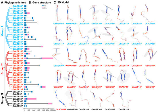 Phylogenetic relationship and 3D models of AG peptide proteins in rice: (A) phylogenetic tree; (B) gene structure of 43 AG peptide genes with a scale bar indicating 500 bp; (C) 3D structural models. Blue boxes indicate the coding regions (CDS), pink boxes indicate 5′ and 3′ and untranslated regions (UTR), black lines indicate introns.