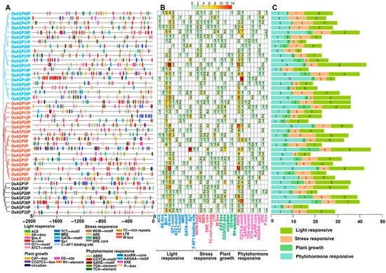 Cis-regulatory element analysis of the AG peptide genes: (A) analysis of cis-elements in the promoter region of AG peptide genes; (B) heatmap of the number of cis-elements, the different colors represent the number of cis-elements; (C) the sum of cis-elements for each category is shown as a histogram.