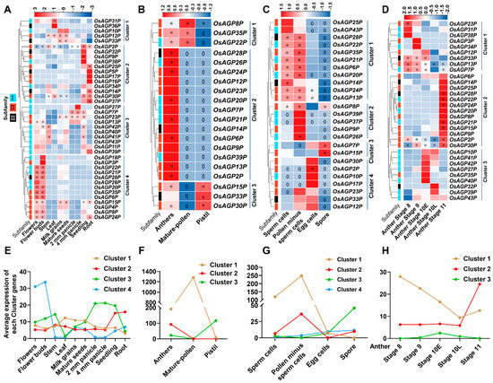The expression profiles of 43 AG peptide genes in various tissues exhibited divergent patterns and were classified into some clusters accordingly (Figure 5A,E). Most genes showed tissue-specific expression functions. Genes in Clusters 1, 2, and 3 were constitutively expressed. The genes in Cluster 1 (OsAGP12P/OsAGP31P/OsAGP33P) displayed higher expression levels in the leaves, milk grains, and mature seeds. The Cluster 2 genes (OsAGP2P/OsAGP9P/OsAGP14P/OsAGP25P/OsAGP30P/OsAGP37P) exhibited higher expression levels in the seedlings and roots. Cluster 3 genes (OsAGP7P/OsAGP13P/OsAGP23P/OsAGP41P/OsAG42P) showed higher expression in the stems, panicles, and seedlings. By contrast, Cluster 4 genes (OsAGP6P/OsAGP8P/OsAGP15P/OsAGP20P/OsAGP21P/OsAGP22P/OsAGP24P/OsAGP28P/OsAGP35P) presented preferential expression in the flowers and flower buds, with expression levels significantly higher than other tissues.