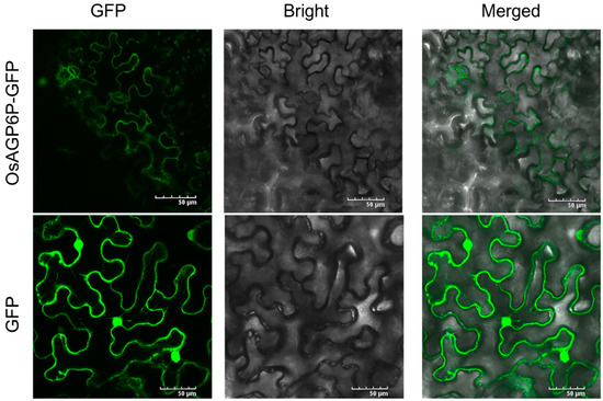 The coding sequence (CDS) of the OsAGP6P gene (excluding the stop codon) was amplified from the rice variety ZH11. Under the control of the CaMV35S promoter, it was fused with the enhanced green fluorescent protein (eGFP) in the vector pD1301S to construct the plasmid OsAGP6P-eGFP. The plasmid was injected into Agrobacterium tumefaciens (EHA105) and transformed into the epidermal cells of 4–6-week-old tobacco (Nicotiana benthamiana L.) leaves according to the method of Kokkirala et al. [70]. After 36–48 h of injection, the subcellular localization of protein OsAGP6P-eGFP was observed using a FluoView FV3000 confocal microscope (Olympus, Tokyo, Japan).