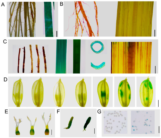 The qualitative detection of the GUS reporter gene for OsAGP6P was conducted following the method of Lee and Schöffl [71]. The expression of OsAGP6P in different tissues was determined in the ProOsAGP6P::GUS (the β-glucuronidase (GUS) reporter gene driven by the promoter of OsAGP6P gene) transgenic lines. The expression of the β-glucuronidase (GUS) reporter gene was observed by histochemical staining [72]. For GUS staining, tissue samples were immersed in 90% acetone for 30 min, then stained in 5-bromo-4-chloro-3-indolyl-glucronide solution at 37 °C overnight. Then, the samples were transferred to 75% ethanol to remove chlorophyll and were observed under a stereomicroscope [73].