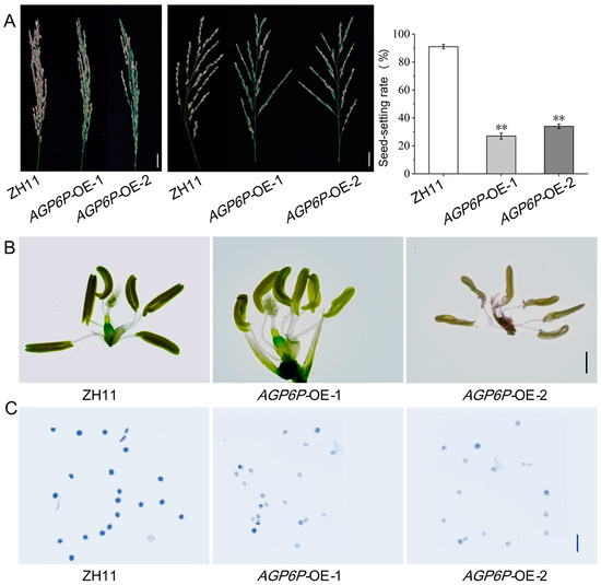 Spikelets, seed-setting rate, florets, and pollen viability of rice with overexpression of OsAGP6P: (A) From left to right, spikelets of T1 generation rice overexpressing OsAGP6P, spikelets of T2 generation rice overexpressing OsAGP6P, seed-setting rate of T2 generation rice overexpressing OsAGP6P. Values represent the means, error bars depict SE (Scale bar, 10 cm. Student’s t-test, n = 10, ** p < 0.01). (B) Flowers of T2 generation rice overexpressing OsAGP6P. Scale bar, 1 mm. (C) I2-KI staining of pollen from T2 generation rice overexpressing OsAGP6P. Scale bar, 100 μm.