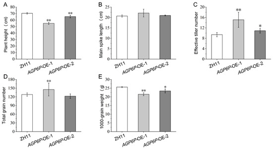 The agronomic traits of ZH11 and OE lines (AGP6P-OE-1, AGP6P-OE-2) plants. (A) Plant height of ZH11 and OE lines. (B) Main spike length of ZH11 and OE lines. (C) Effective tiller number of ZH11 and OE lines. (D) Total grain number of ZH11 and OE lines. (E) 1000-grain weight of ZH11 and OE lines. Three repetitions for 10 plants each (3 replicates × 10 individuals). Values represent the means, error bars depict SE (Student’s t-test, n = 10, * p < 0.05, ** p < 0.01).