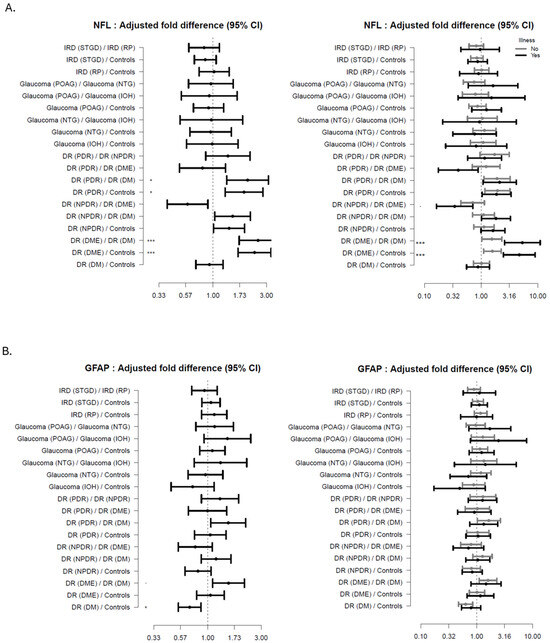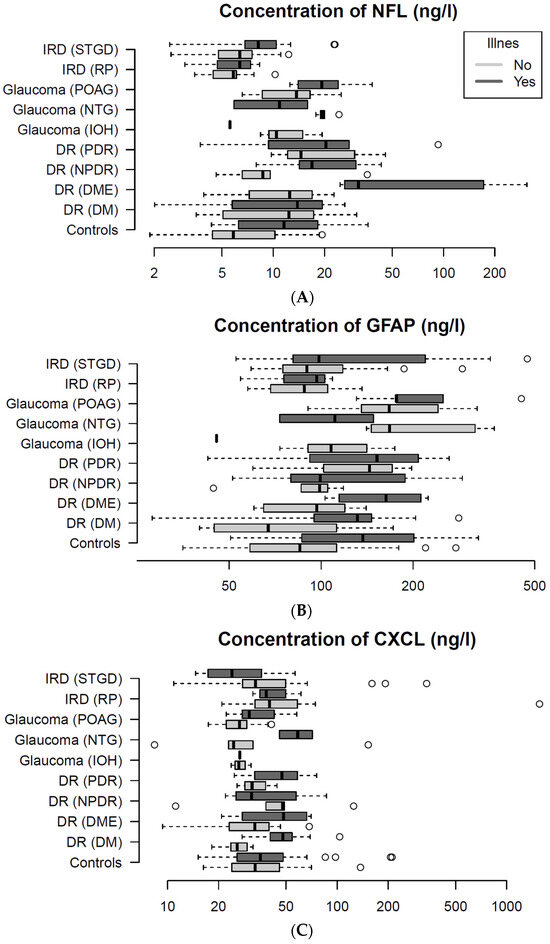 In Figure 1, NFL, GFAP, and CXCL13 plasma concentrations are presented according to presence of illness for each disease subgroup. The biomarker concentrations vary depending on the type of biomarker, underlying retinal disease, and presence of comorbidities. Biomarker concentrations were generally higher in the ill subgroups.