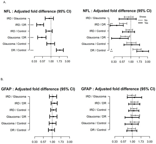 Forest plots showing the age-adjusted fold-difference in plasma-levels between the disease subgroups with 95% confidence intervals (95% CI). The left panel shows the results of the primary analysis and the right panel the results of the corresponding subgroup analysis with participants stratified according to presence of illness. (A) Neurofilament Lights Chain (NFL), (B) Glial Fibrillary Acidic Protein (GFAP), (C) C-X-C Motif Chemokine Ligand 13 (CXCL13). adj-p < 0.1 * adj-p < 0.05, *** adj-p < 0.001.