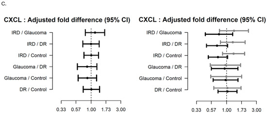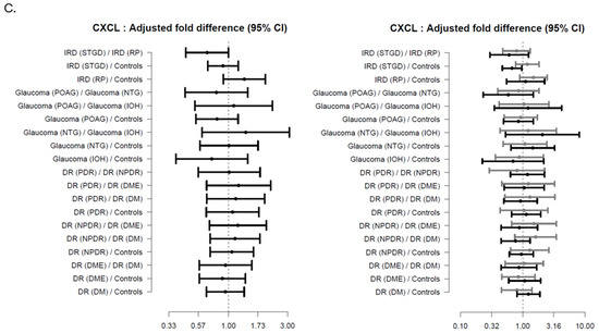 As seen from Figure 3A–C (subgroups) patients with advanced DR (PDR, DME) had increased levels of NFL (age-adjusted) compared to DM (FD 2.52 (95%CI: 1.71; 3.72, p < 0.001; adj-p < 0.001 and FD 2.04 (95%CI: 1.33; 3.12, p < 0.001; adj-p < 0.001), respectively) and HC (FD 2.35 (95%CI: 1.67; 3.30, p < 0.001; adj-p < 0.001), and FD 1.89 (95%CI: 1.28; 2.79, p < 0.001; adj-p < 0.001) respectively); In the same patients with no comorbidities a trend increase was found. Additionally, an increasing trend in NFL levels were found in NPDR compared to DM and HCs, and a decreasing trend was found in NPDR compared to DME participants.