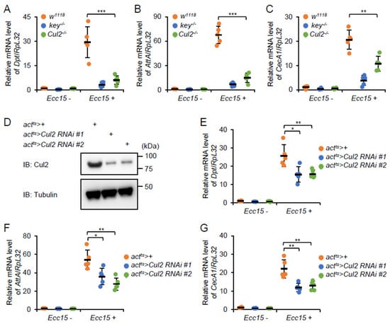 To investigate the potential involvement of Cul2 in the Drosophila IMD signaling-mediated immune response, we infected the Cul2EY09124 loss-of-function (LOF) mutants (referred to as Cul2-/-, isogenized with w1118) and the age-paired w1118 flies (control) with Pectobacterium carotovorum carotovorum 15 (Ecc15). In addition, the isogenized keyc02831 LOF mutants (referred to as key-/-) were also used for Ecc15 infection in these experimental approaches. Ecc15 has been widely used to induce IMD signaling in adult flies, which can be easily monitored by looking at the expression levels of the IMD downstream AMP genes, for instance, Diptericin (Dpt), Attacin A (AttA), and Cecropin A1 (CecA1) at 12 h post Ecc15 stimuli []. A marked induction of Dpt, AttA, and CecA1 was indeed observed in the w1118 control flies 12 h after Ecc15 infection (Figure 1A–C), suggesting that IMD signaling is activated by Ecc15 in adult flies. Moreover, the Ecc15-induced expressions of these AMPs were drastically prevented in the key LOF mutant flies (Figure 1A–C), which were consistent with previous findings []. In addition, the transcript levels of Dpt, AttA, and CecA1 were decreased by more than 50% in the Cul2 LOF mutant flies (Figure 1A–C). These data indicate that Cul2 is required for the robust activation of IMD signaling in adult flies upon bacterial challenge.